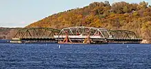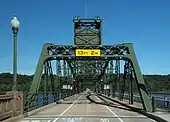The Stillwater Bridge (alternatively known as the Stillwater Lift Bridge, St. Croix River Bridge at Stillwater, Mn/DOT Bridge #4654, and Wis/DOT Bridge #M-61) is a vertical-lift bridge crossing the St. Croix River between Stillwater, Minnesota, and Houlton, Wisconsin. It formerly connected Minnesota State Highway 36 and Wisconsin Highway 64. Around 18,000 vehicles crossed the bridge daily.[2] The new St. Croix Crossing bridge crossing the St. Croix river valley to the south of Stillwater replaced its purpose, having opened to highway traffic on August 2, 2017, leaving the Stillwater Lift Bridge to be preserved and to be converted to bicycle/pedestrian use.[3]