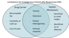 There are many limitations that exist within the field of endogenous chemically responsive drug delivery systems that prevent many of these products from approved to be used in a clinical setting. One of the primary challenges of endogenous chemically responsive drug delivery is the inability to address or overcome patient heterogeneity. Patient heterogeneity describes the naturally-occurring difference between patient biology, such as differences in tumor pH for the same cancer and blood concentrations of redox reagents.[1] The targeting of many chemical properties in pathological tissues is also restricted by a small range of fluctuation of the chemical property, which prevents researchers from being able to safely and specifically target that diseased tissue and stimulus due to small windows of sensitivity that have yet to be optimized.[5]ref name=":5">Chen, Huachao; Liu, Danyang; Guo, Zijian (2016-03-05). "Endogenous Stimuli-responsive Nanocarriers for Drug Delivery". Chemistry Letters. 45 (3): 242–249. doi:10.1246/cl.151176. ISSN 0366-7022.</ref>. Other important limitations to consider include the formulation of the drug carrier, which can affect the clearance rate and biodistribution of the drug carrier and decrease therapeutic efficacy due to size, shape, or effective penetration of the tissue by the drug carrier.[5]ref name=":5" />. Biocompatibility and toxicity of the drug carrier formulation also poses a significant challenge to the development of the field, so future studies need to be conducted using inherently biocompatible materials to ensure feasibility and safety of these proposed delivery systems. Finally, cost of production and the scalability of the creation of stimuli responsive drug delivery systems remains an enormous barrier between the development and clinical use of these delivery systems.