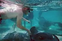 Today, tour and excursion boats, along with private watercraft, gather at Stingray City in large numbers. There is a wide variety of companies that offer Stingray City excursions, which all have their own unique features. Passengers disembark and enter the chest-high water to interact with the stingrays. The boats' proprietors bring along with them pails of chunked-up squid meat, which they dispense by hand to the animals, thus attracting dozens of the creatures to the feeding spot. Visitors can visit Stingray City and pet stingrays, while standing in only 3 feet of water.[4] There are however growing concerns about alterations in behaviour, feeding patterns and general ecology of these rays, when compared to rays not receiving supplemental nutrition.[5]