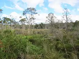 Stingray Swamp is composed of a rich array of flora and fauna, which is influenced to a large extent by the underlying biophysical and geomorphic character.[3] The flora of the immediate region consists of dry sclerophyll forest, montane peat shrubs and Cumberland plain woodland species. Stingray swamp exhibits a distinctive and rich mixture of heath, shrub, grasses and fern species. The central areas within the swamp are dense with low canopies of around 1.5–2 meters in height. Leptospermum and coral fern species are dominant features within the floral makeup of the ecosystem. Vegetation grades to open woodland on the outer edges and away from swamp areas. These areas are dominated by eucalyptus species in the range of 5–15 meters tall. Animal species range from birds, reptiles, insects and mammals with current records indicating 15 species. Most notable is the variety of birdlife due to dense vegetation, which has drawn bird watching groups. SWFR is also host to several state and nationally protected and endangered species.[4] Of note are the following species that area listed at State and National levels: