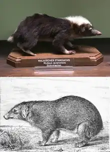 Stink badgers were traditionally thought to be related to Eurasian badgers in the subfamily Melinae of the weasel family of carnivorans (the Mustelidae), but recent DNA analysis indicates they share a more recent common ancestor with skunks, so experts have now placed them in the skunk family[4][5] (the Mephitidae, which is the sister group of a clade composed of Mustelidae and Procyonidae, with the red panda also assigned to one of the sister clades[6]). The two existing species are different enough from each other for the Palawan stink badger to be sometimes classified in its own genus, Suillotaxus.[4]