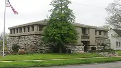 Walter Burley Griffin studied under Frank Lloyd Wright, and while his early work was similar to Wright's Prairie School designs, his later work exhibited an Expressionist influence as well; the Stinson Memorial Library was one of the latter designs. The building's exterior consists of three main design elements: a tall limestone base, a concrete band of windows encircling the top of the base, and large concrete pillars on either side of the entrance. The limestone in the base is roughly cut and coursed to give the building a natural appearance.[2] The windows in the upper band are made from leaded glass and feature concrete piers on each side. The sill and lintel of the windows continuously circle the building; the lintel is topped by the library's low hip roof.[3]