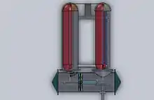 Stirling patented a second hot air engine, together with his brother James, in 1827.[11] They inverted the design so that the hot ends of the displacers were underneath the machinery, and they added a compressed air pump so the air within could be increased in pressure to around 20 standard atmospheres (2,000 kPa).