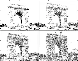 The image to the left shows an original picture of the Arc de Triomphe in Paris. If this image is passed through a nonlinear threshold filter in which each pixel detects light intensity as above or below a given threshold, a representation of the image is obtained as in the images to the right. It can be hard to discern the objects in the filtered image in the top left because of the reduced amount of information present. The addition of noise before the threshold operation can result in a more recognizable output. The image below shows four versions of the image after the threshold operation with different levels of noise variance; the image in the top right hand corner appears to have the optimal level of noise allowing the Arc to be recognized, but other noise variances reveal different features.