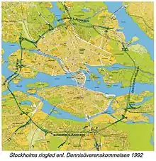 The first plan to build a motorway ring road around central Stockholm arose in the 1950s. The recent ring road project in Stockholm has its origin in the Dennis Agreement (Dennisöverenskommelsen) from 1992, which was a political agreement (negotiated by the Bank of Sweden governor Bengt Dennis) to build new roads and improve public transport in and around Stockholm. As the agreement was eventually broken in 1997 due to criticism from environmental groups and the political parties left outside the agreement, the future of a complete ring road became uncertain.[1]