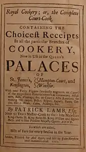 Lamb started his career at an early age as pastry assistant and rose rapidly in the kitchen hierarchy. He became very prosperous and wrote a well-known, still extant book, Royal Cookery, whose front page is shown. In 1685 he prepared King James II's Coronation Feast,[4] which was described in detail by Francis Sandiford in his book.[5] The King was so pleased with his work that he gave him a large number of gold coins.[6]