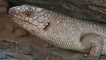 Egernia stokesii is a gregarious species of lizard of the Scincidae family.[3] This diurnal species is endemic to Australia, and is also known as the Gidgee skink, spiny-tailed skink, Stokes's skink and Stokes's egernia.[4] The species forms stable, long-term social aggregations, much like the social groups seen in mammalian and avian species.[5] This characteristic is rarely found in the Squamata order, but is widespread within the Australian subfamily of Egerniinae skinks.[4][6] Populations of E. stokesii are widely distributed, but fragmented, and occur in semi-arid environments.[7] There are three recognised subspecies.[8] The conservation status for the species is listed as least concern, however, one subspecies is listed as endangered.[1][8]