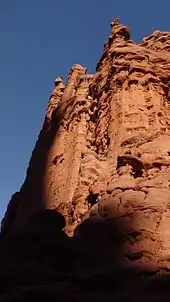 The Stolen Chimney is a traditional rock climbing route located on the Ancient Arts tower of one of the Fisher Towers. This is the most common route to ascend the cork screw summit of the tower. The cork screw summit is the westernmost summit of the Ancient Arts tower but it is not the tallest. The summit is noteworthy for its extremely unusually shape which makes climbing the technically different from most other climbs. The unusual shape also makes it visually striking. Photographs of the cork screw summit have been extensively published in many settings including mainstream advertisements.[1][2][3]
