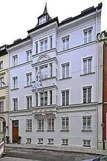The original three-storey residential building on a square floor plan was built in 1856 on behalf of Julius Grubert, Managing Director of Palmsche Hofbuchhandlung, it was designed by Matthias Berger and supervised by Friedrich Bürklein. The original façade tiling, signed by Berger[4] and Bürklein, shows a sparing division in the Maximilian style, with Gothic elements on the flat center-piece crowned with a pointed helmet. On the courtyard side, the construction was higher due to an additional lower level.[3]