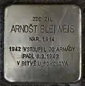 HERE LIVED ARNOŠT BLEIWEIS BORN 1914 DEPORTED 1942 JOINED THE ARMY KILLED IN ACTION 8.3.1943 BATTLE OF SOKOLOVO |
