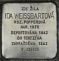 HERE LIVED IDA WEISSBARTOVÁ NÉE POPPEROVÁ BORN 1876 DEPORTED 1942 TO THERESIENSTADT MURDERED 1942 IN IZBICA |