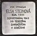 HERE LIVED ELSA STEINOVÁ BORN 1886 DEPORTED 1943 TO THERESIENSTADT MURDERED IN AUSCHWITZ |