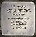HERE LIVED KARLA PICKOVÁ BORN 1869 DEPORTED 1943 TO THERESIENSTADT MURDERED |