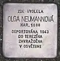 HERE LIVED OLGA NEUMANNOVÁ BORN 1888 DEPORTED 1943 TO THERESIENSTADT MURDERED IN AUSCHWITZ |