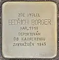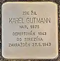 Karel Glauber, also Karl, was born on 14 June 1937 in Horažďovice. His parents were Valtr Glauber and Gertruda née Zinner (see below). On 26 November 1942, the boy was deported from Klatovy to Theresienstadt concentration camp by transport Cd. His transport number was 124 of 651. His mother was deported to Auschwitz concentration camp and murdered there on 16 January 1943. The little boy was deported on 18 December 1943 to Auschwitz by transport Ds. His transport number was 2219 of 2,503. There the Nazis took the life of the six years old boy.[16][17][18]