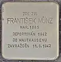 HERE LIVED FRANTIŠEK MÜNZ BORN 1885 DEPORTED 1942 TO MAUTHAUSEN MURDERED 11 June 1942 |
