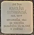 Gertruda Glauberová née Zinner, also called Gertrude or Trude, was born on 24 August 1909 in Hlinsko. Her parents were Ludwig Zinner and Stefanie née Bergmann, also Steffi. She had a sister named Marianna, born on 20 March 1906, later married as Kraus. She married Valtr Glauber (see above). The couple had a son, Karel, born in 1937 (see above). She was arrested, separated from her child and deported to Auschwitz concentration camp. There she was murdered on 16 January 1943.[23][24]