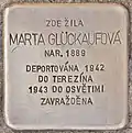 HERE LIVED MARTA GLÜCKAUFOVÁ BORN 1889 DEPORTED 1942 TO THERESIENSTADT 1943 TO AUSCHWITZ MURDERED |