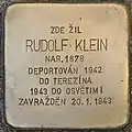 HERE LIVED RUDOLF KLEIN BORN 1878 DEPORTED 1942 TO THERESIENSTADT 1943 TO AUSCHWITZ MURDERED 20 January 1943 |