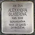 HERE LIVED ALEXANDRA GLASEROVÁ BORN 1930 DEPORTED 1941 TO ŁÓDŹ MURDERED |