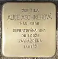 HERE LIVED ALICE ASCHNEROVÁ BORN 1896 DEPORTED 1941 TO ŁÓDŹ MURDERED EBENDORT |