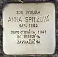 HERE LIVED ANNA SPITZOVÁ BORN 1902 DEPORTED 1941 TO THERESIENSTADT MURDERED |