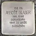 HERE LIVED AŘNOST GLASER BORN 1898 DEPORTED 1941 TO ŁÓDŹ MURDERED |