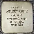 HERE LIVED AŘNOST SPITZ BORN 1896 DEPORTED 1941 TO THERESIENSTADT MURDERED |