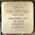 HERE LIVED EMIL ASCHNER BORN 1884 DEPORTED 1941 TO ŁÓDŹ MURDERED IN AUSCHWITZ |