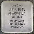 HERE LIVED DR.JUR. IRMA GLASEROVÁ BORN 1901 DEPORTED 1941 TO ŁÓDŹ MURDERED |
