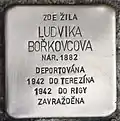 HERE LIVED LUDVIKA BOŘKOVCOVA BORN 1882 DEPORTED 1942 TO THERESIENSTADT 1942 TO RIGA MURDERED |