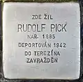 HERE LIVED RUDOLF PICK BORN 1885 DEPORTED 1942 TO THERESIENSTADT MURDERED |