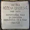 HERE LIVED RŮŽENA LINDTOVÁ BORN 1866 DEPORTED 1942 TO THERESIENSTADT MURDERED 13.3.1943 EBENDORT |