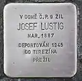 HERE LIVED IN HOUSE No. 9 JOSEF LUSTIG BORN 1887 DEPORTED 1945 TO THERESIENSTADT SURVIVED |