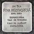 HERE LIVED IRMA WEISSKOPFOVÁ BORN 1889 DEPORTED 1942 TO THERESIENSTADT 1942 TO WARSAW MURDERED |