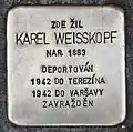 KAREL WEISSKOPF BORN 1883 DEPORTED 1942 TO THERESIENSTADT 1942 TO WARSAW MURDERED | Hejmanské hráze 11 48°57′33″N 14°56′00″E |
