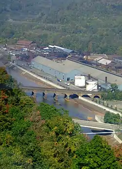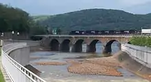 The Stone Bridge spans the Conemaugh River in Johnstown, Pennsylvania. The bridge is a seven-arch stone railroad bridge located on the Norfolk Southern Railway mainline, built by the Pennsylvania Railroad in 1887-88. Its upstream face was reinforced with concrete in 1929.[1]