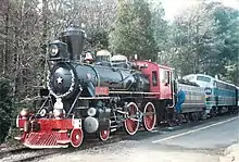 - #110, The Yonah II - a former McRae Lumber & Manufacturing 2-6-2 steam locomotive built by the Vulcan Iron Works in 1927. The engine went to the Beechwood Band Mill in Cordele, Georgia, in 1930 before being sold in 1933 to the Cliffside Railroad.[4] The Cliffside retired the engine when the road dieselized in 1962,[5] and sold it the following year to the Swamp Rabbit Railroad in Cleveland, South Carolina, who sold the engine to Stone Mountain in 1969.[6] First steam locomotive to be withdrawn from active service, having encountered running gear issues in 1982. Placed on display at the Memorial Depot in 1984. The Stone Mountain Memorial Association donated the engine to the New Hope Valley Railway in Bonsal, North Carolina in 2012, and the engine was moved to the railway in early February 2013. The New Hope Valley intends to restore the engine to operating condition, which is anticipated to take five to seven years at an estimated cost of $600,000 based on an initial survey of the engine performed in 2012. The engine was given a cosmetic restoration and placed on display, while the railway continues to evaluate the engine's components and raise funds for operation.
