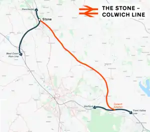 The line diverges from the Trent Valley Line at Colwich Junction and runs through to join the Stafford to Manchester Line at Stone.