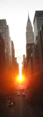 - Manhattanhenge, in New York City, due to the street grid's skew of about 28.9° and the strict grid plan on most of the Manhattan isle, the sunset is aligned with the street grid lines in May and July and the sunrise is so aligned in December and January.