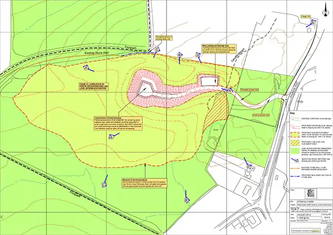 Phase two is the extraction of the cap stone in front of the main portals to Stonehills Mine. After the extraction of all rubble/overburden in autumn 2015, the remaining Cap, Roach and whitbed is extracted to create a level working area inferno of the mine portals.[6]