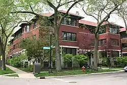 Stoneleigh Manor is a historic apartment building at the northwest corner of Michigan Avenue and Main Street in Evanston, Illinois. The three-story brick building was built in 1913. Architect John A. Nyden, an Evanston resident who designed several apartment buildings in the city, designed the building in the Prairie School style. The building's design includes canopied entrances flanked by columns and leadlights, limestone banding, and wide overhanging eaves. Each floor of the building has four rooms, which included amenities such as sunrooms, fireplaces, a vacuum cleaning system, and maid's rooms in some units.[2][3]