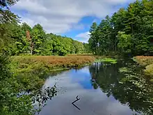 Its farthest upstream tributary is Beaver Brook, originating in Wolf Swamp in Boxborough, 22 miles (35 km) upstream (southwest) of the mouth of Stony Brook in the Merrimack.[1] Beaver Brook passes through Mill Pond in the center of Littleton and ends at Forge Pond at Forge Village in Westford.
