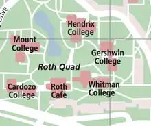 Roth quad surrounds Roth pond and is made up of 5 buildings: Cardozo, Gershwin (24Q & CO), Hendrix, Mount (SF), and Whitman. All buildings have a suite style floor plan composed of doubles. Residents in Roth quad are part of the Science and Society Undergraduate College (SSO), placing and emphasis on the implications of not only science on society, but society on science. The buildings in Roth quad are the only quad style buildings that have air conditioning other than the Nobel Halls.