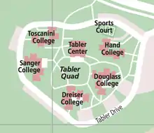 Tabler quad surrounds a meadow and is made up of 5 buildings: Douglass, Dreiser (24Q & SF), Hand (CO), Sanger and Toscanini. All buildings have a suite style floor plan composed of doubles. Residents in Tabler are part of the Undergraduate College of Arts, Culture and Humanities (ACH), placing a large emphasis on music and art and its relation to other disciplines. Additionally, Toscanni College houses the Stony Brook University honors college.[12]