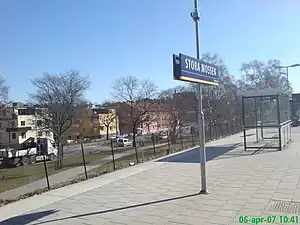 Stora Mossen metro station is a station on the Green line of the Stockholm metro. It is located on the border between the districts of Ulvsunda and Stora mossen, which are part of the borough of Bromma in the west of the city of Stockholm. The station is on an embankment and has a single island platform, with access from a pedestrian subway under the line linking Drottningholmsvägen and Stora Mossens Backe.[2][3] The distance to Slussen is 9 km (5.6 mi).