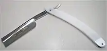 A straight razor is a razor with a blade that can fold into its handle.[1][2] They are also called open razors and cut-throat razors.[3][4][5] The predecessors of the modern straight razors include bronze razors, with cutting edges and fixed handles, produced by craftsmen from Ancient Egypt during the New Kingdom (1569 — 1081 BC). Solid gold and copper razors were also found in Ancient Egyptian tombs dating back to the 4th millennium BC.