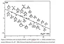 According to the VSEPR theory of molecular bonding, the preferred geometry of a molecule is that in which both bonding and non-bonding electrons are as far apart as possible. In molecules, it is quite common for these angles to be somewhat compressed or expanded compared to their optimal value. This strain is referred to as angle strain, or Baeyer strain.[9] The simplest examples of angle strain are small cycloalkanes such as cyclopropane and cyclobutane, which are discussed below. Furthermore, there is often eclipsing or Pitzer strain in cyclic systems. These and possible transannular interactions were summarized early by H.C. Brown as internal strain, or I-Strain.[10] Molecular mechanics or force field approaches allow to calculate such strain contributions, which then can be correlated e.g. with reaction rates or equilibria. Many reactions of alicyclic compounds, including equilibria, redox and solvolysis reactions, which all are characterized by transition between sp2 and sp3 state at the reaction center, correlate with corresponding strain energy differences SI (sp2 -sp3).[11] The data reflect mainly the unfavourable vicinal angles in medium rings, as illustrated by the severe increase of ketone reduction rates with increasing SI (Figure 1). Another example is the solvolysis of bridgehead tosylates with steric energy differences between corresponding bromide derivatives (sp3) and the carbenium ion as sp2- model for the transition state.[12] (Figure 2)