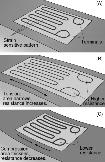 A strain gauge (also spelled strain gage) is a device used to measure strain on an object. Invented by Edward E. Simmons and Arthur C. Ruge in 1938, the most common type of strain gauge consists of an insulating flexible backing which supports a metallic foil pattern. The gauge is attached to the object by a suitable adhesive, such as cyanoacrylate.[1] As the object is deformed, the foil is deformed, causing its electrical resistance to change. This resistance change, usually measured using a Wheatstone bridge, is related to the strain by the quantity known as the gauge factor.