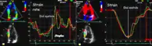 Strain rate imaging is a method in echocardiography (medical ultrasound) for measuring regional or global deformation of the myocardium (heart muscle). The term "deformation" refers to the myocardium changing shape and dimensions during the cardiac cycle. If there is myocardial ischemia, or there has been a myocardial infarction, in part of the heart muscle, this part is weakened and shows reduced and altered systolic function. Also in regional asynchrony, as in bundle branch block, there is regional heterogeneity of systolic function. By strain rate imaging, the simultaneous function of different regions can be displayed and measured. The method was first based on colour tissue Doppler.[1] by using the longitudinal myocardial velocity gradient, already in use transmurally.[2] Later, the regional deformation has also been available by speckle tracking echocardiography,[3][4] both methods having some, but different methodological weaknesses. Both methods, however, will acquire the same data (measurements may differ somewhat, however, being method dependent), and also can be displayed by the same type of display.